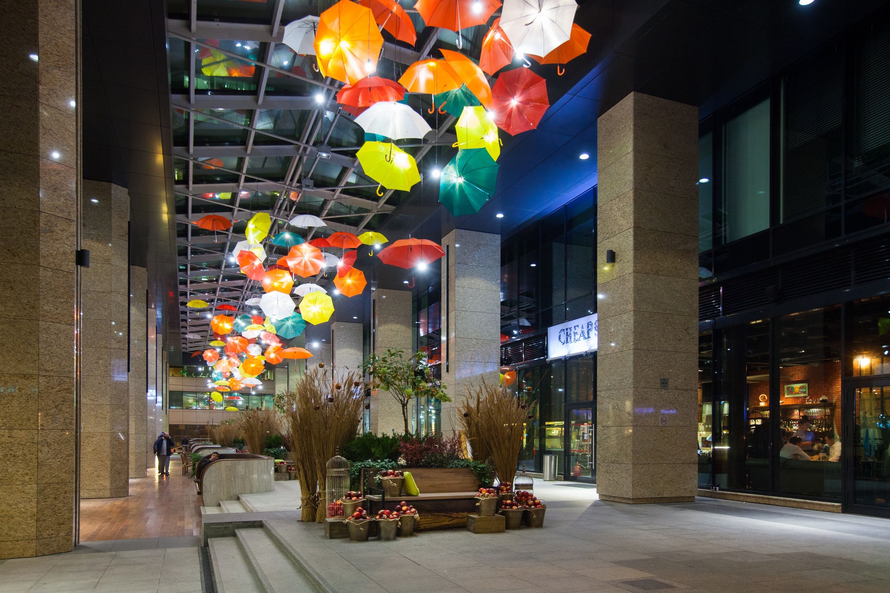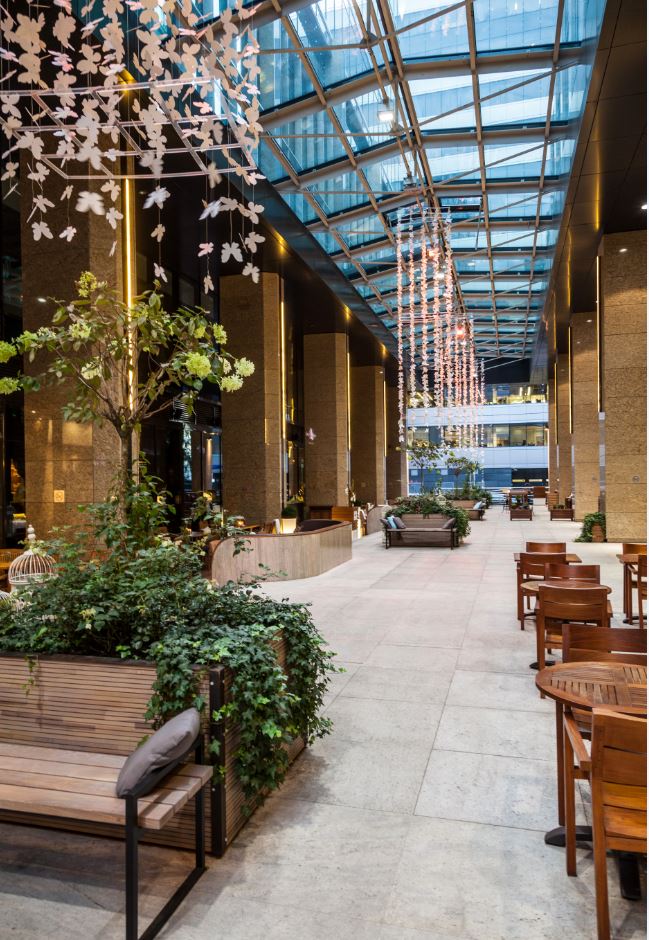 На привлекательность бизнес-центра влияет не только его высокая технологичность, но и смелые и эффективные дизайнерские решения. На каждом ярусе объекта расположены террасы с роскошными садами: так бизнес-центр отвечает своему названию и поддерживает качественное впечатление у арендаторов. Лобби комплекса также выглядят современно и изящно: в них предусмотрено дизайнерское оформление и созданы лаунж-зоны. Кроме того, на первых этажах бизнес-центра присутствует развитая инфраструктура, которая представлена различными ресторанами, кафе, магазинами и салонами. Здесь можно комфортно работать и не менее комфортно отдыхать, то есть проводить целые дни на территории делового квартала.